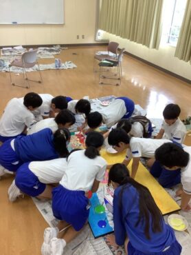 2025.10.4 学校 6年生 6年総合的な学習の時間 6年生は総合的な学習の時間に「150周年を盛り上げようプロジェクト」で未来に残る壁画を製作しています。 「二塚の過去と未来をつなぐ」をテーマに構想を練り、仕上げてきました。 学習発表会当日は、製作途中の作品を展示し、今後完成を目指していきます。 壁画のほかにも、6年生の児童が作成した歴史年表や年代別人気ランキングが、歴史資料室に展示してあるので、ぜひ見に来てくださいね。