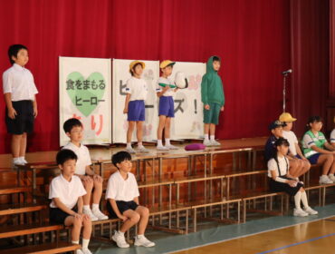 プログラム3番は、3年生による総合的な学習の時間の発表「ぼくらの二塚ヒーローズ」。