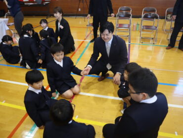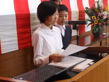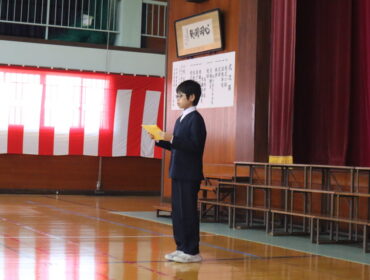 始めは、6年生が総合的な学習の時間に二塚小学校について調べたことをクイズ形式にして紹介しました。