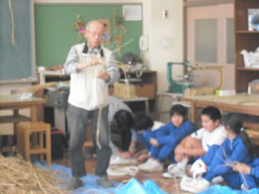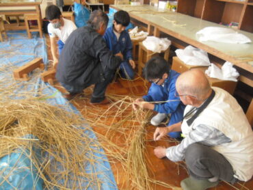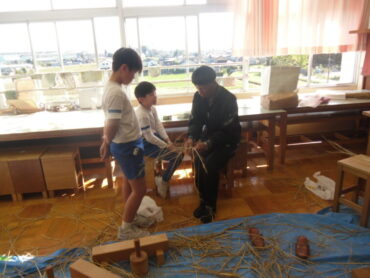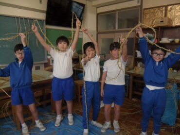 2025.10.26 学校 5年生 5年 ものづくり・デザイン科 「わら細工②」 前回の「わら綯い体験」を生かし、今日は、縄をついで、長い縄を作る体験をしました。 左右の太さをそろえ、縄をついでいくのは大変でしたが、講師の方に教えて頂き、集中して取り組みました。 身長の2倍以上の長さになったり、作った縄で縄跳びをしたり。 次回は、それぞれが作りたいリースやしめ飾りに合った太さの縄を、作っていきます。