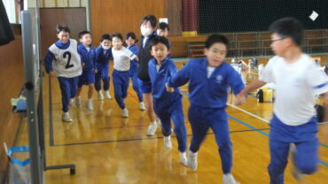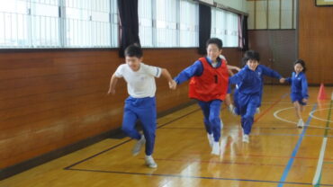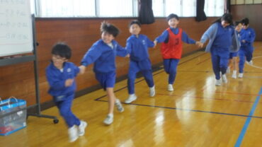 【手つなぎラン】 手をつないで体育館を一周走ります。