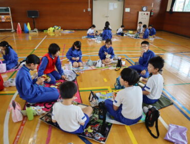オリエンテーリングで体を動かした後は、みんなでおいしくお弁当を食べました。
