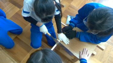 2025.11.25 学校 4年生 4年生 図画工作科 4年生の図画工作科では、コリントゲームの製作を始めました。 初回は、枠を作るために必要な角材をのこぎりで切りました。 初めての両刃のこぎりに緊張していた児童もいましたが、正しい寸法で切り分けることができました。 今後は、デザインや彩色、ニス加工を経て、かなづちで釘を打つ活動も行う予定です。