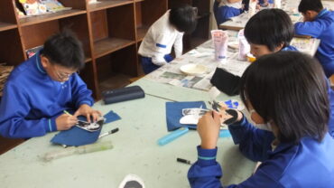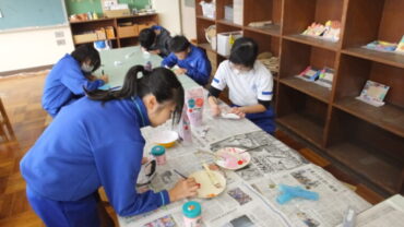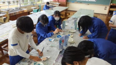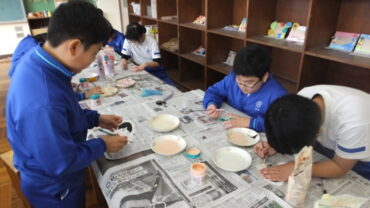 2025.12.4 NEW 学校 6年生 6年 総合的な学習の時間 6年生は総合的な学習の時間に「創校150周年をお祝いしようプロジェクト」と題し、様々な活動に取り組んできました。 そして、今回はその活動の一つ、壁画制作の最終段階に取り組みました。 記念式典では、途中段階で背景のみ描いて展示していましたが、いよいよ、その中に自分たちを描きました。 来週に貼るので、完成が楽しみです。