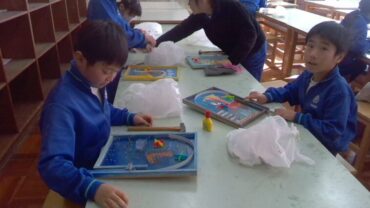 2025.12.12 学校 4年生 4年生 コリントゲーム完成! 4年生の図画工作科でつくってきた「コリントゲーム」が完成しました。 デザインや得点、配置を考えて釘を打ち、様々な種類やゲーム性のある台になりました。 完成後は、友達のゲームを遊んで回り、感想を伝えたり、得点を競ったりして楽しみました。