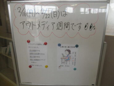 2026.2.20 学校 全校生 家族でアウトメディアチャレンジ 後半です 2/16(月)~2/22(日)は、第3回家族でアウトメディアチャレンジ週間です。 家族でメディアのルールを決めて、アウトメディアに取りくむのは、これが今年度最後となります。 保健体育委員会がお昼の放送で、アウトメディアについて呼びかけたり、目の体操の動画を、各クラスで流すよう呼びかけたりしています。 2/19(木)は折り返しの日です。 後半もアウトメディアを意識して、身も心も健康に過ごせると良いですね。