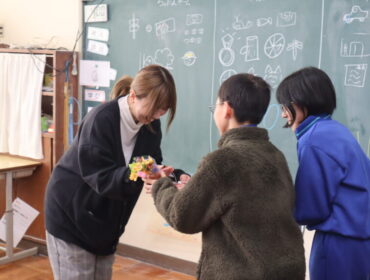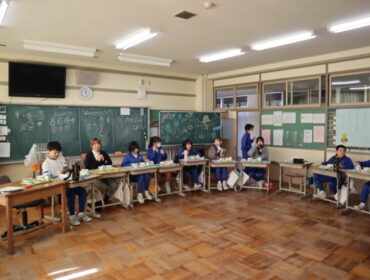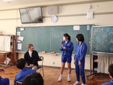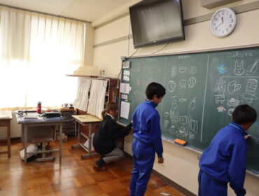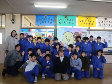 2026.2.20 学校 6年生 6年 総合的な学習の時間 2月19日(木)に二塚小学校応援キャラクター「ゆたか」のデザインをしてくださった、ちったんさんをお招きして「ゆたか誕生を祝う会」を行いました。 絵描きしりとりゲームをしたり、ゆたかパネルの前で記念撮影をしたりしました。 楽しんでもらえ、6年生もにこにこでした。 集会の後は、ちったんさんを招いて、給食を食べました。 小学校時代を思い出してくれたみたいです。